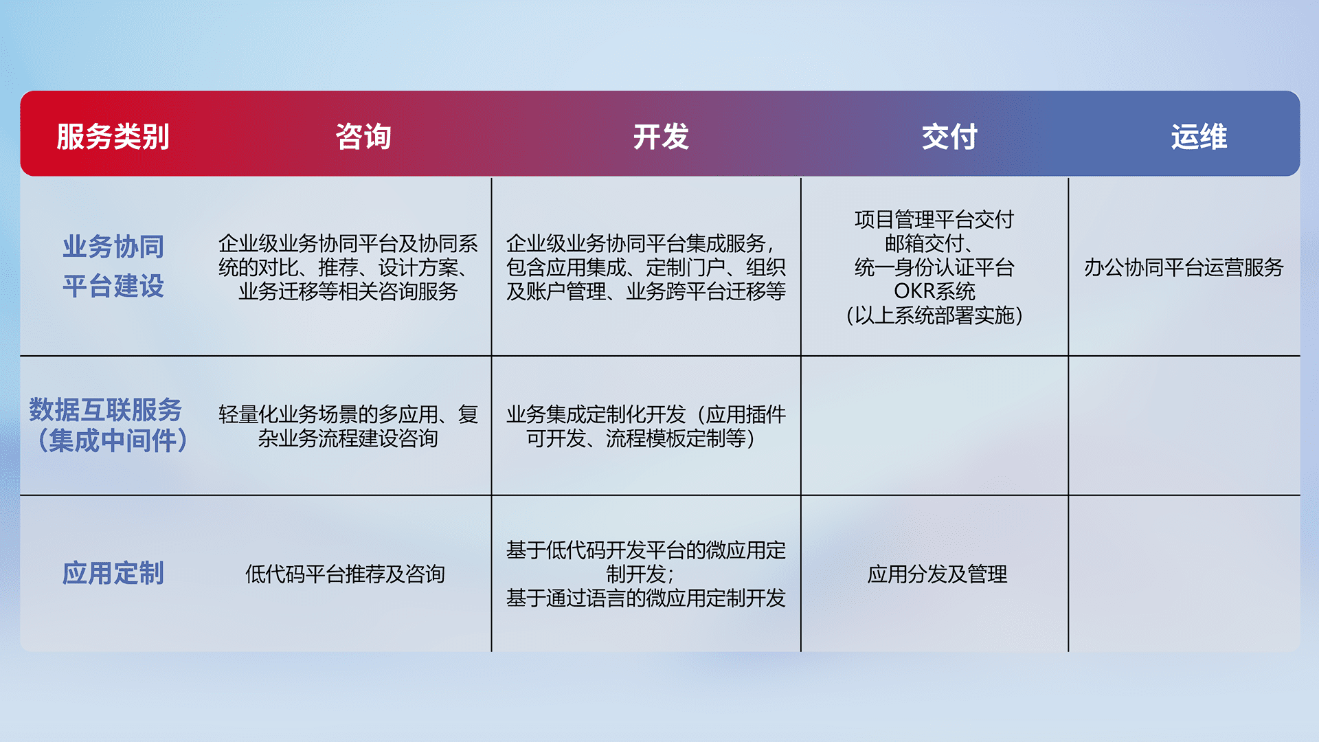 针对钉钉、、、、企微、、IDaas等平台级产品提供产品的规划、、、、方案、、、、交付、、、定制化开发等服务,,,,实现如统一协同办公、、、智能客户服务、、、、混合会议管理、、智能数据查询、、、、等业务场景,,,实现数字化转型。。。。