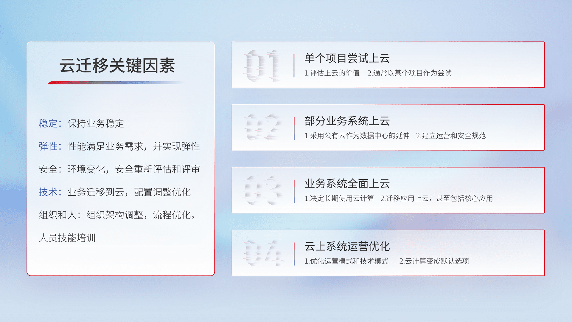 结合实际业务,,从规划设计、、、云平台选型、、、、云原生改造、、、、数据迁移、、、、集成交付,,,迁移全过程为客户识别最佳上云路径,,,,做好风险识别管理,,,,设计网络架构、、身份权限、、安全审计合规、、操作审计、、、、日志审计、、、监控告警策略、、多站点容灾设计等,,,,对云上基础设施进行整体规划,,,,提升IT治理水平,,,,以满足弹性、、、高可用、、、高性能的需求。。