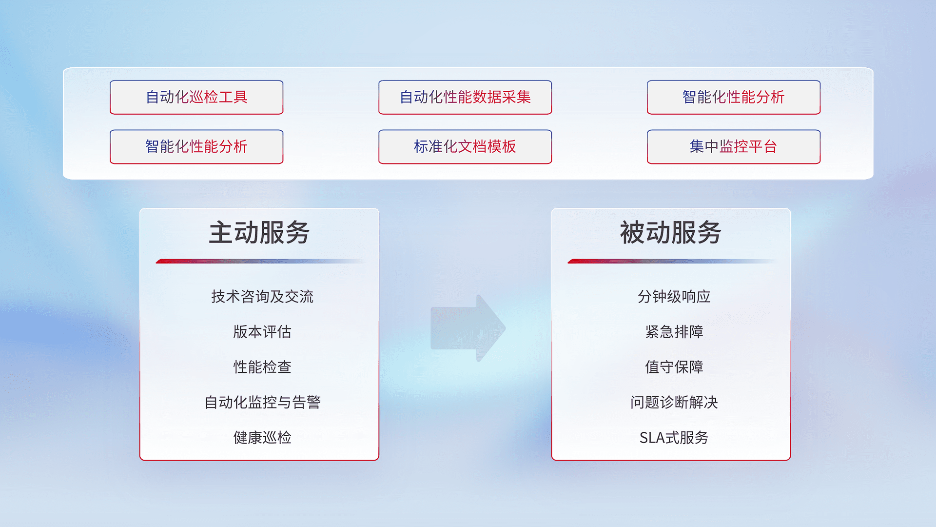 智能化工具和标准化文档,,,保障服务质量,,,,提供主动服务(包含技术咨询、、、版本评估、、性能检查、、自动化监控与告警、、、、健康巡检)和被动服务包含(分钟级响应、、、、紧急排障、、、值守保障、、、、问题诊断解决、、、SLA服务)。。